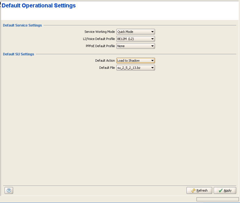 The Default Operational Settings page enables viewing and modifying general default parameters related to service provisioning and new SUs that join the network.