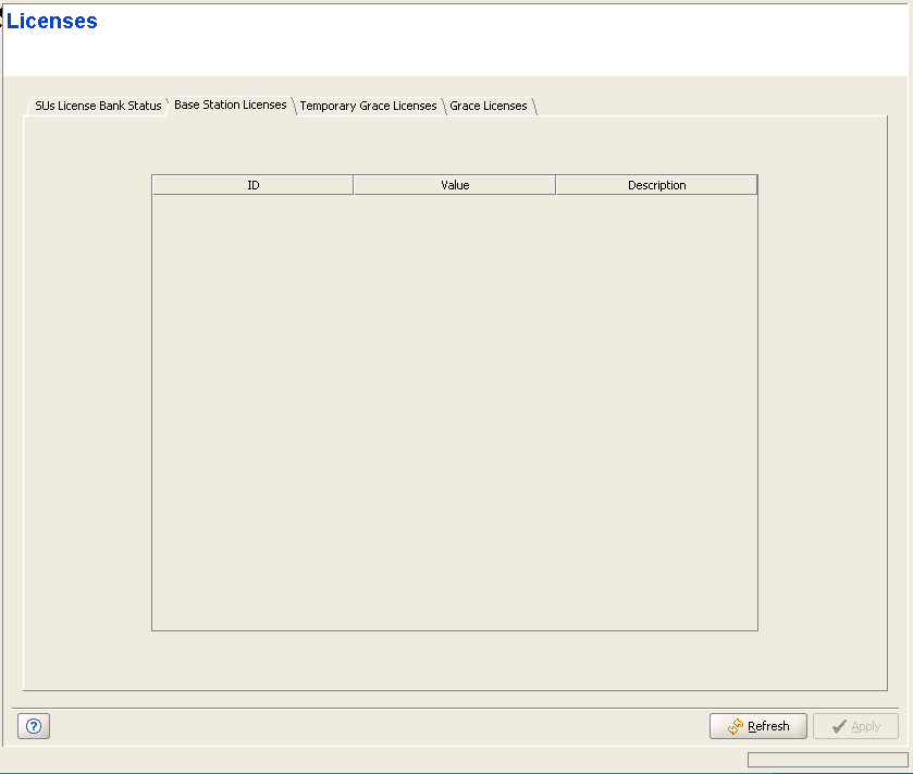The Base Station Licenses tab displays the current Base Station/Micro Base station Licenses (if available). The displayed information for each license type includes:
