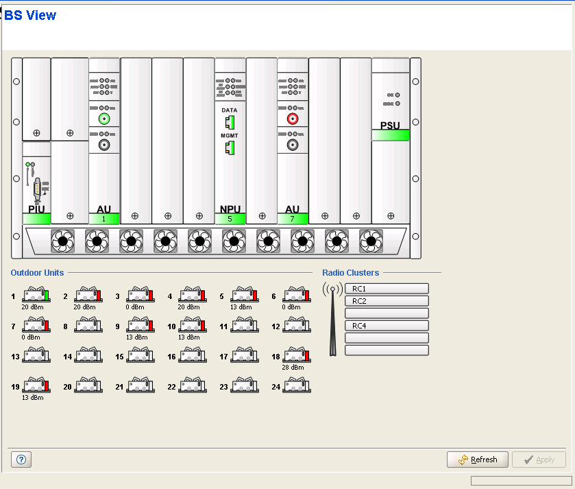 The BS View page provides a graphical view of the current status of the Base Station's components.