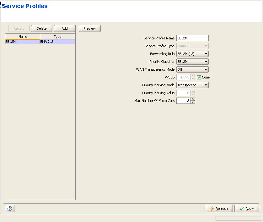 Select a Service Profile's entry. The current Service Profile configuration details will be displayed on the right side of the page, enabling modification of parameters. Click Apply to update the Service Profile's configuration. You can click on the Preview button to view the parameters of all elements of the Service Profile (Forwarding Rule, Priority Classifier and the relevant QoS Profiles) before applying the change.