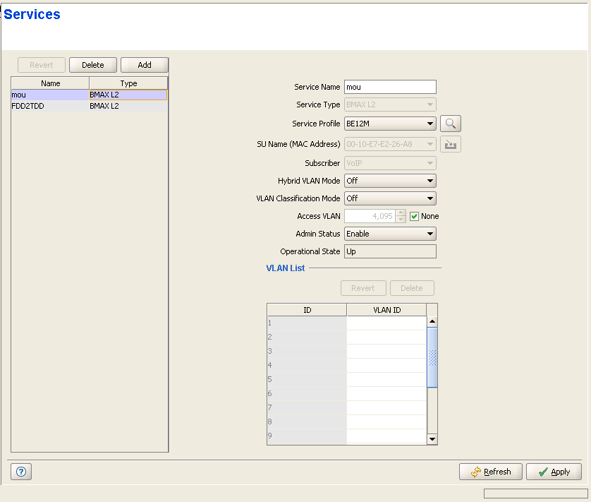 A table of VLAN IDs listing the VLAN IDs behind the same SU associated with the applicable Subscriber. When Hybrid VLAN Mode is Off, the VLAN List can include up to 16 VLAN IDs. When Hybrid VLAN Mode is On, the VLAN List can include up to 15 VLAN IDs (the 16th entry is reserved for No VLAN). The maximum total number of VLAN IDs behind a single SU is 16. (15 when a Service with Hybrid VLAN Mode On is assigned to the SU). To avoid conflicts it is not allowed to define a VLAN ID that is identical to any VPL ID (applicable only for transparent Service Profiles). A specific VLAN ID behind a certain SU can be associated only with a single service of a certain service type. It is not possible to define two services of the same service type for the same SU and the same VLAN ID. The VLAN ID's value can be from 0 to 4094. |