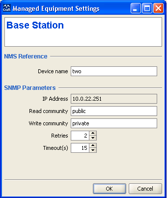 2 From the drop-down menu, select the Equipment Type: BreezeMAX BS (modular Base Station) or BreezeMAX MBS (Micro Base Station). Click OK. The Equipment Editor opens, allowing to define the Device Name and SNMP properties of the device to be managed.