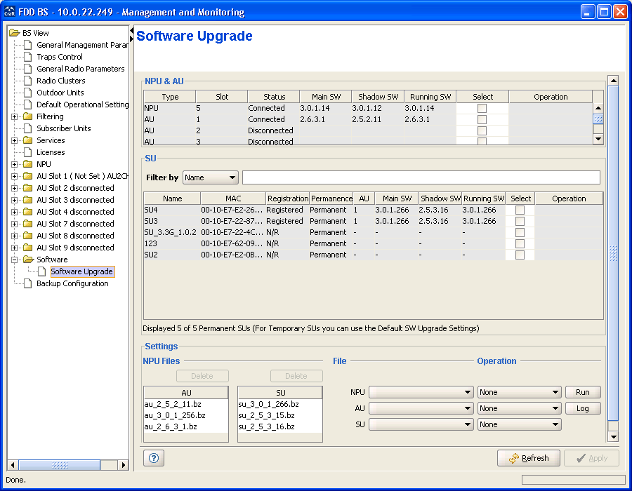 The system will automatically identify the files and use the correct file for each device type. To ensure a smooth upgrade process while minimizing the risk of loosing connectivity to Base Station, the order of upgrading devices is: first the SUs, then AUs (in a modular Base Station), then the NPU/Micro Base Station.