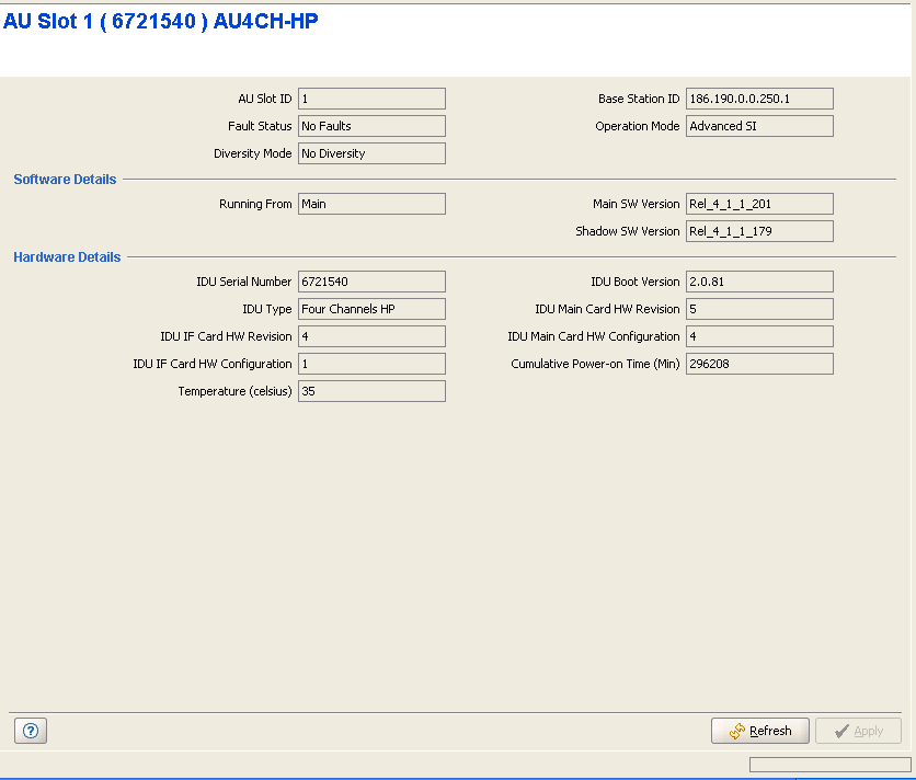 The AU View page provides general details on the hardware and software of the AU.