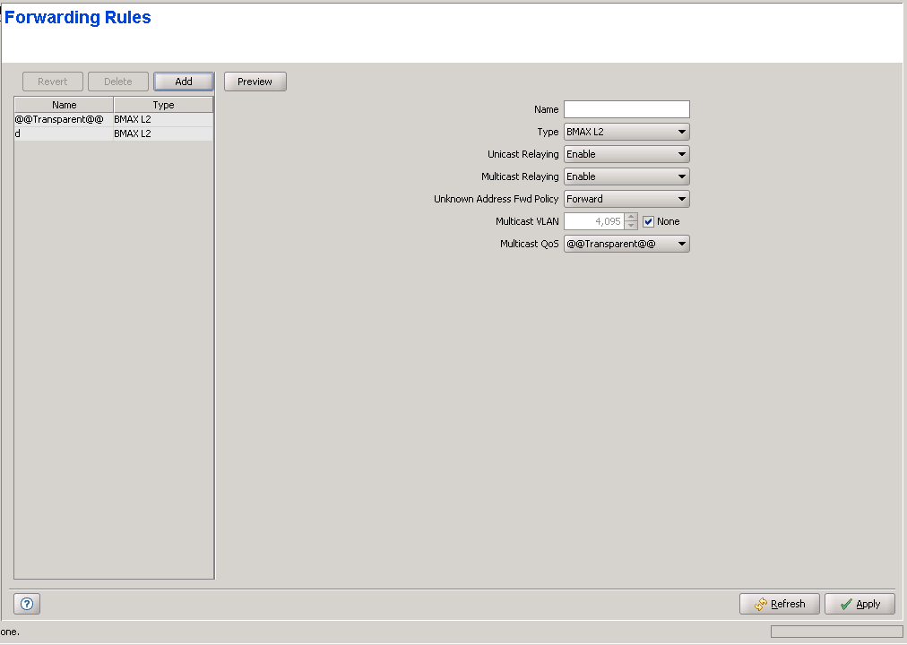 Click on the Add button. The Forwarding Rule Editor will be displayed on the right side of the page. To add a new Forwarding Rule to the database of the device, fill in the necessary parameters and click Apply. You can click on the Preview button to view the parameters of the Forwarding Rule, including the details of the relevant QoS Profile, before applying the change.