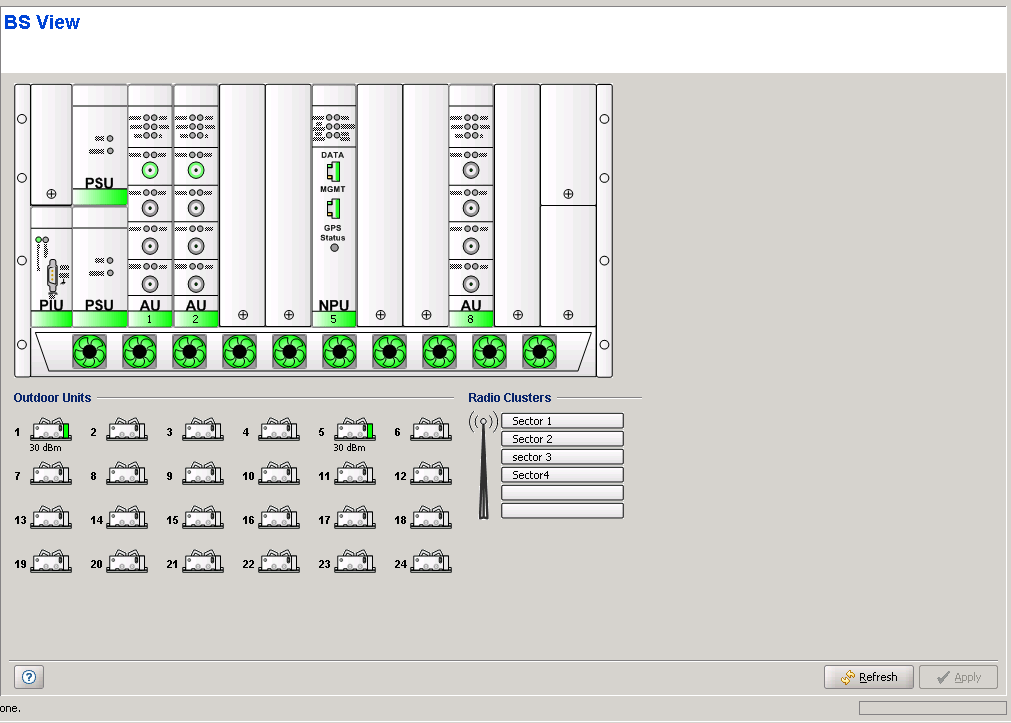 The BS View page provides a graphical view of the current status of the modular Base Station's components.