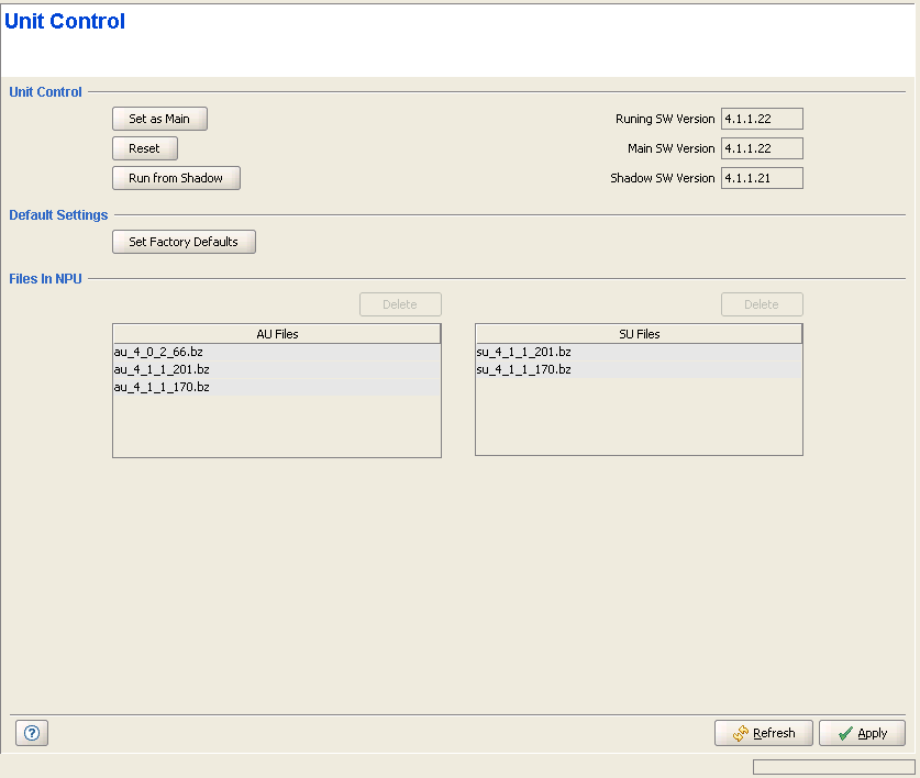 The Unit Control page enables managing the SW versions of the NPU/Micro Base Station, resetting the managed device to its default configuration and managing the AU (NPU only) and SU SW Files in the managed device.