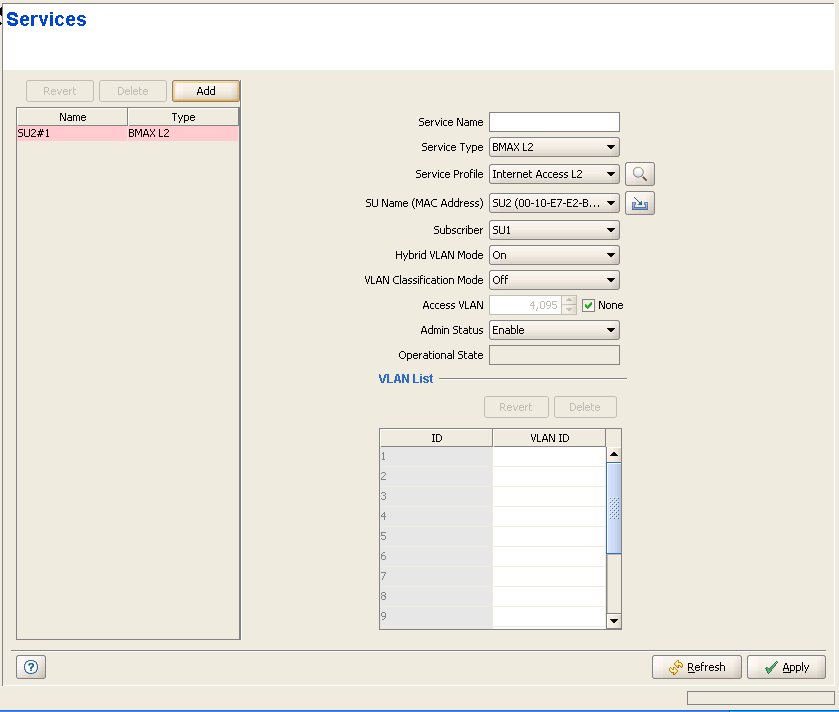 Not applicable in IP CS Switching Mode. Read-only for Temporary Services in Ethernet CS Switching Mode. A table of VLAN IDs listing the VLAN IDs behind the same SU associated with the applicable Subscriber. When Hybrid VLAN Mode is Off, the VLAN List can include up to 16 VLAN IDs. When Hybrid VLAN Mode is On, the VLAN List can include up to 15 VLAN IDs (the 16th entry is reserved for No VLAN). The maximum total number of VLAN IDs behind a single SU is 16. (15 when a Service with Hybrid VLAN Mode On is assigned to the SU). To avoid conflicts it is not allowed to define a VLAN ID that is identical to any VPL ID (applicable only for transparent Service Profiles). A specific VLAN ID behind a certain SU can be associated only with a single service of a certain service type. It is not possible to define two services of the same service type for the same SU and the same VLAN ID. The VLAN ID's value can be from 0 to 4094. |