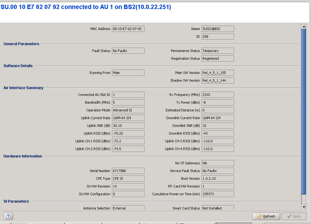 - Service Fault Status (OK or reason for denying services to the SU: Loop or Duplicate SU Name).