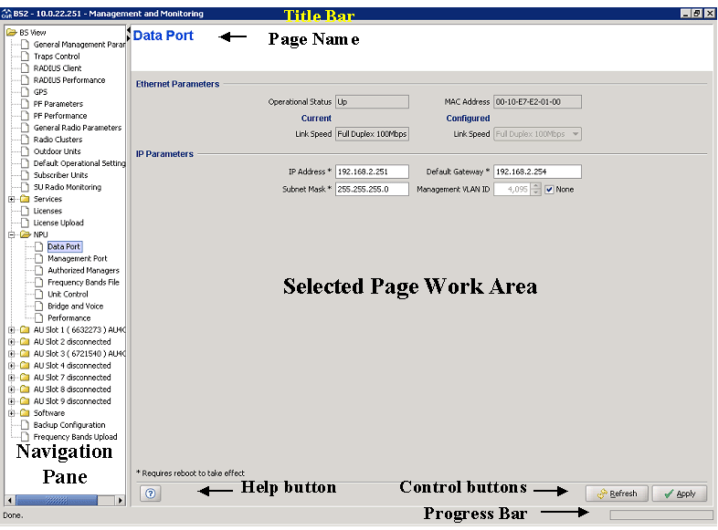 Identifies the managed device's name. It also includes standard icons for minimizing, maximizing or closing the Device Manager. |
