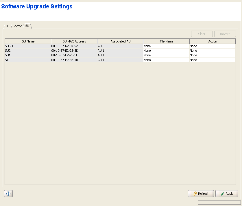 The SU tab of the Software Upgrade page enables defining for each SU the SW File Name and Action to take effect immediately after clicking Apply.